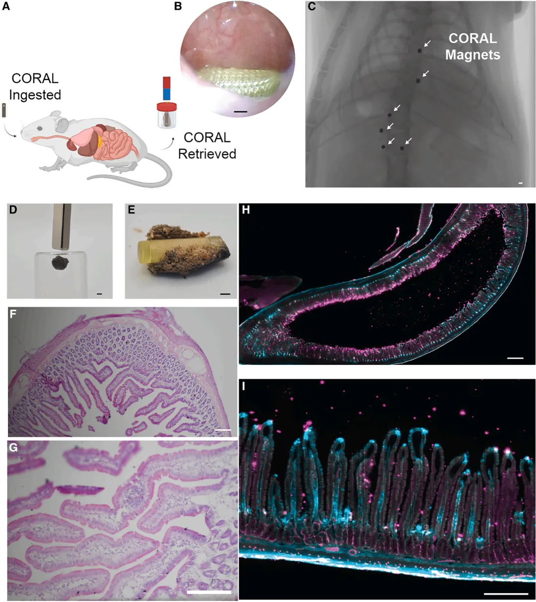 体内实验进一步证实了CORAL胶囊的实用性。研究人员在17只白鼠体内进行了实验,并利用内置磁铁成功回收排泄的胶囊。组织学分析和CLARITY优化光片显微镜显示,胶囊通过后肠道黏膜结构保持完整,未见损伤或出血迹象。