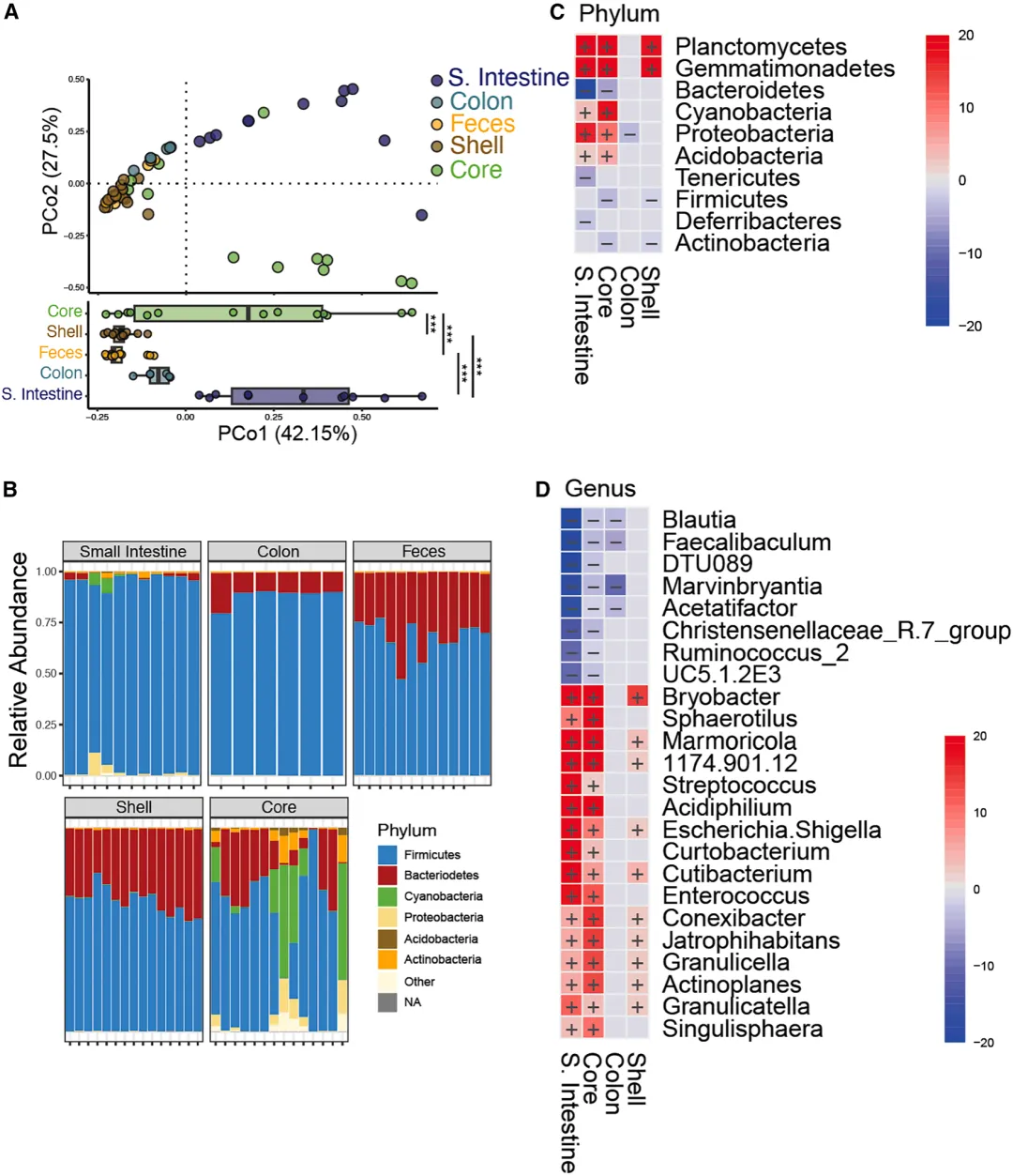 rRNA基因测序分析表明,CORAL胶囊采集的微生物组成与小肠组织样本高度相似,而与粪便样本存在显著差异。在门水平上,CORAL组和小肠样本几乎只有厚壁菌门,而粪便样本含有较高比例的拟杆菌门。在属水平上,CORAL组和小肠样本中乳酸杆菌比例较高,而粪便中则富含普雷沃菌科、别样杆菌等。