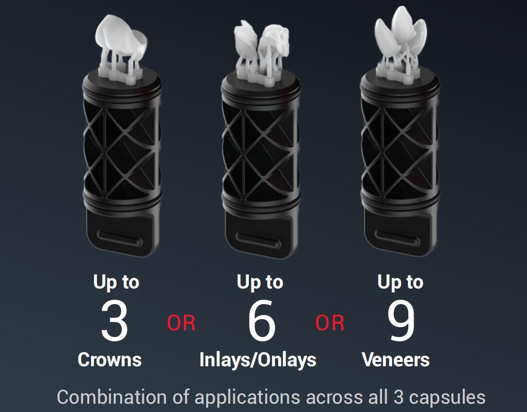 第三步:打印,Midas可同时打印3个胶囊,10分钟即可完成3个牙冠或者更多的修复应用。