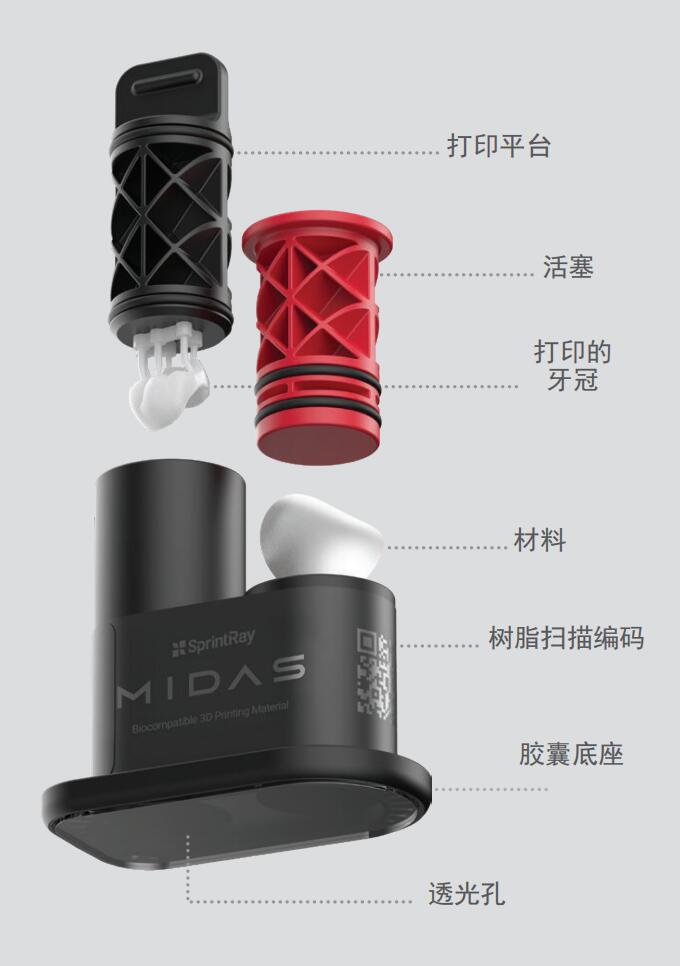 3)胶囊陶瓷材料技术:配合独特的胶囊陶瓷材料技术,Midas能够在保证打印质量的同时,打印时间与传统3D打印产品相比大大缩短。