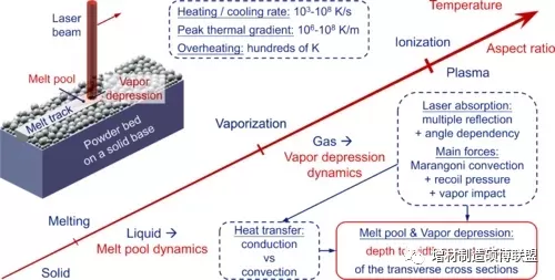 作者首先阐述了金属激光粉末床熔融增材制造中的一般物理过程,着重强调了两个关键耦合现象:熔化和汽化,匙孔前壁液态突出物和匙孔失稳。这些物理现象驱动了熔池和匙孔的形貌演化,是激光熔化模式定义的基石。