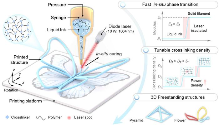 从团队发布的技术原理图中可以看出,这个3D打印技术首先有一个墨水直写的打印头来挤出树脂材料,然后利用可精准控制的激光,在热固性材料从打印喷头挤出的瞬间对其进行固化。打印过程中,集成激光聚焦于微米级聚合物射流,通过强光热效应使热固性材料在