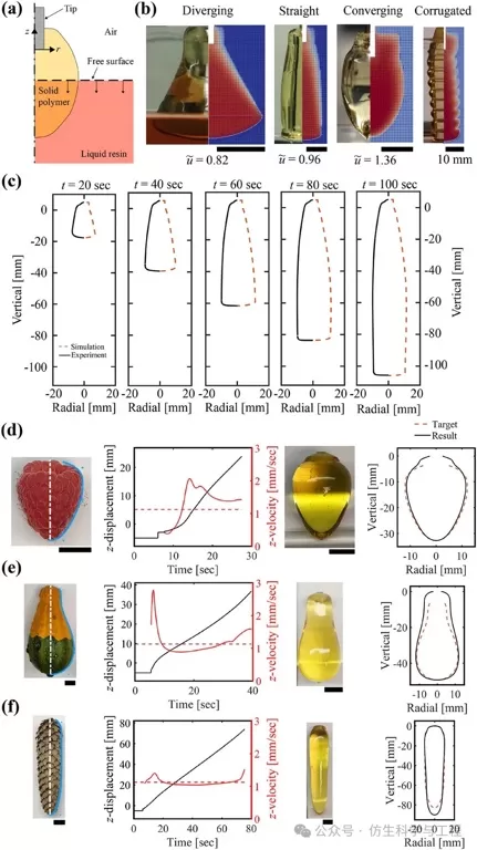 轴对称结构:通过调节引发剂移动速度与固化前端速度的比值(𝑢̃),可打印发散、直筒、收敛等形状。例如,覆盆子、南瓜等自然形状均可精准复刻。