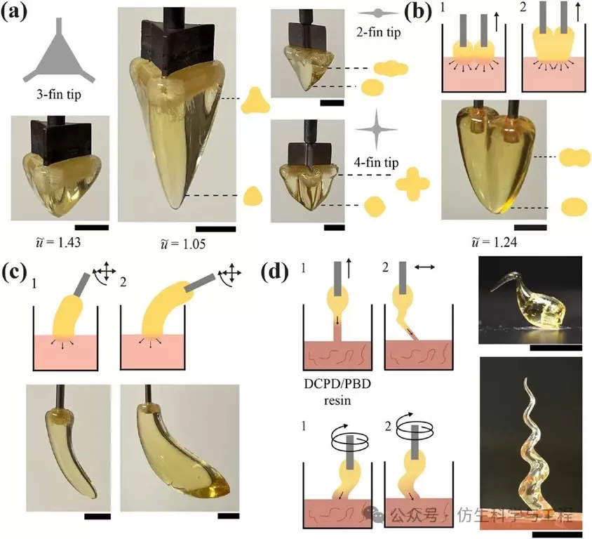 粘度改性树脂,可在拉制的粘性细丝内形成前缘。在这里,聚合前沿可以在树脂丝中从桶中传播出来。通过拼版水平或螺旋尖端运动,分别产生奇异鸟和螺旋角形状。