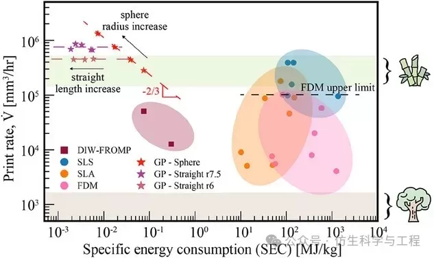 图5.各种增材制造工艺的打印速率和比能耗 (SEC)。文中讨论了与 GP 过程测量相关的趋势(星号和虚线)。GP 数据点(星号)是从 GP 实验中测量的。r 是打印球体或直圆柱体的半径(以mm为单位)。