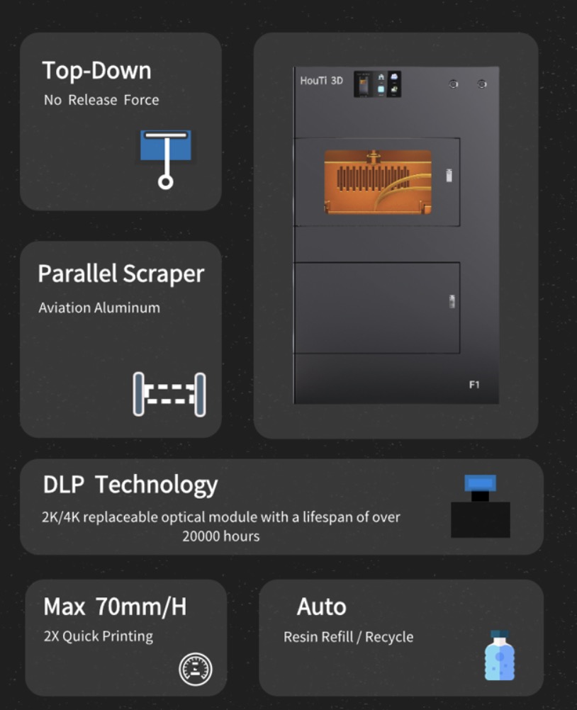 后天科技的目标是在行业内打造一款操作简便、精度卓越且成功率高的下沉式光固化3D打印机。Houti F1系列打印机的设计旨在解决传统3D打印机常见的问题,如离型失败和模型变形。打印机具备一系列显著的优势,包括调平便捷、打印质量高、设备稳定性强等特点。