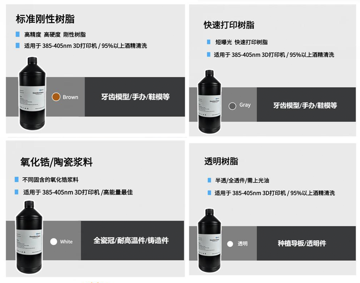 为进一步提升打印质量,Houti F1还配备了官方推荐的四种配套树脂材料,分别为:标准刚性树脂、氧化锆/陶瓷浆料、快速打印树脂和透明树脂。这些树脂材料经过精心调配,能与设备的性能完美匹配,帮助用户轻松实现优质的打印效果。