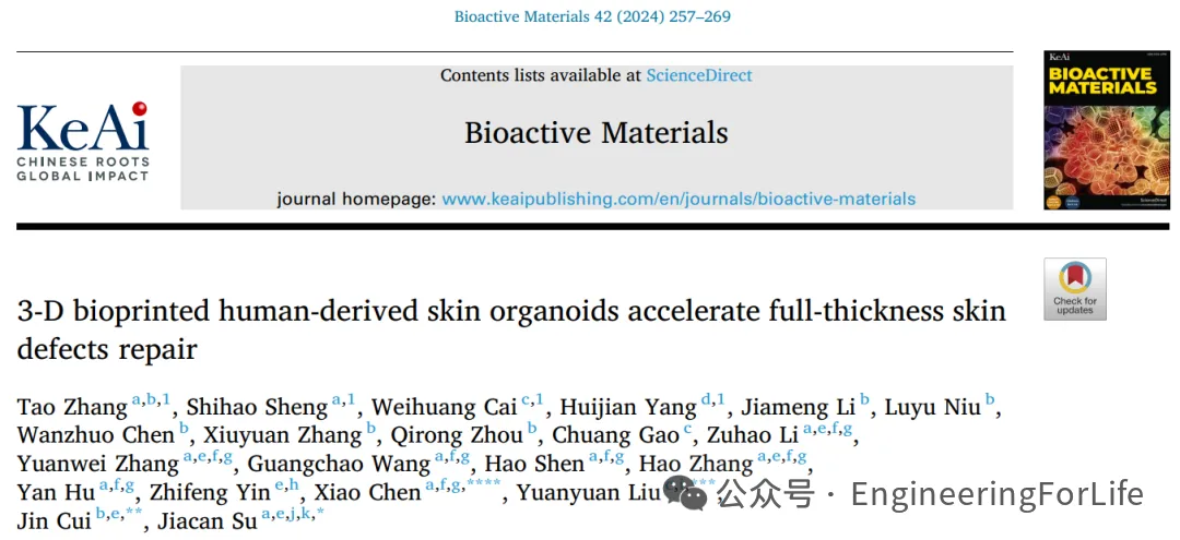 本期,EFL以发表在杂志《Bioactive Materials》上的“3-D bioprinted human-derived skin