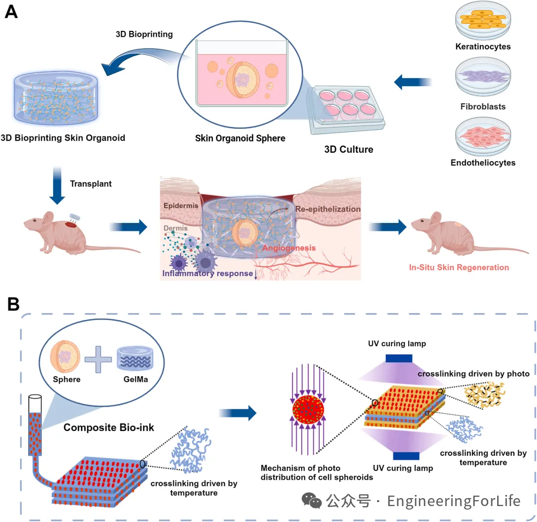 本研究的核心创新在于将皮肤类器官与生物3D打印技术深度融合:首次通过三细胞自组装构建具有仿生结构的皮肤类器官球,并开发新型生物墨水(10%