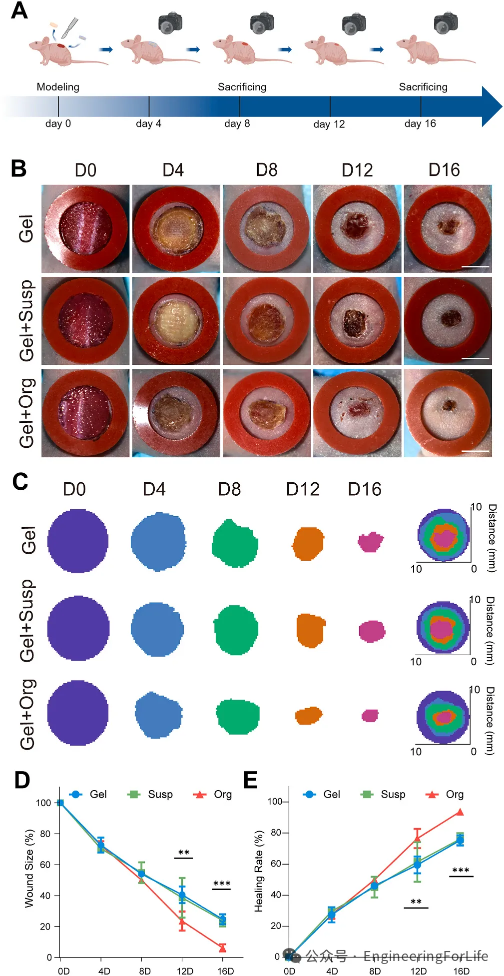 该研究通过裸鼠全层皮肤缺损模型评估生物3D打印皮肤类器官的疗效。结果显示,类器官移植组伤口闭合速度显著优于凝胶组与细胞悬液组,术后16天愈合率达93.8%。早期观察显示类器官与宿主整合良好,未引发明显炎症,并加速上皮迁移与屏障重建。该支架通过促进原位再生显著提升愈合效率,证实其优于传统单一疗法。