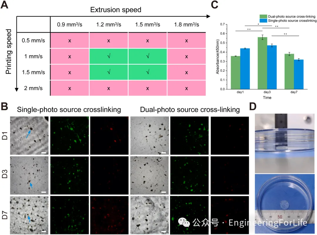 之后通过优化生物墨水打印参数与交联策略提升3D打印效果。挤出速度测试表明,1.2–1.5