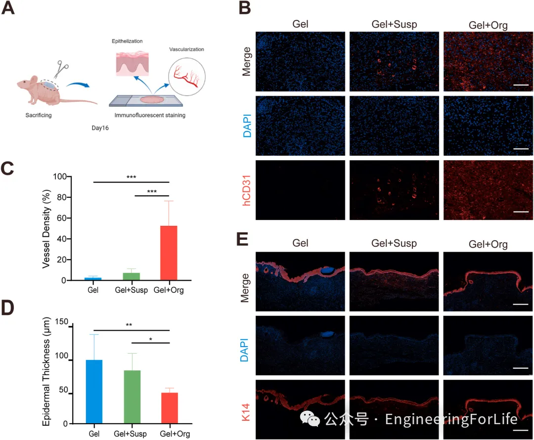 研究进一步证实了生物3D打印皮肤类器官显著促进创面再上皮化与血管生成。免疫荧光显示,类器官组CD31标记的新生血管密度显著高于对照组(p<0.01),表明其增强血供支持组织修复。K14染色显示类器官组表皮基底层干细胞富集,且表皮厚度更接近正常皮肤,提示其通过定向调控角质细胞增殖优化屏障重建。该支架通过协同促进血管网络形成与表皮功能化再生,实现高质量皮肤修复。