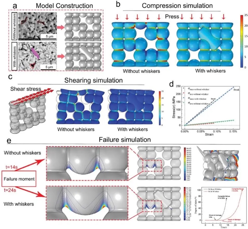 为了进一步了解晶须原位增强的机理,研究者基于陶瓷的微观结构特征设计了二维单层结构的简化模型。将原HAP晶粒简化为球形,将柱状晶须简化为柱状(图3a)。从图3c可以看出,晶须的存在显著提高了支架的变形抗力;应力轮廓图显示,无须支架的微孔中存在明显的应力集中。瞬态模型模拟结果显示,陶瓷基体内的柱状晶须结构有效地缓解了应力集中,延缓了损伤的发生,提高了支架的力学性能(图3e)。