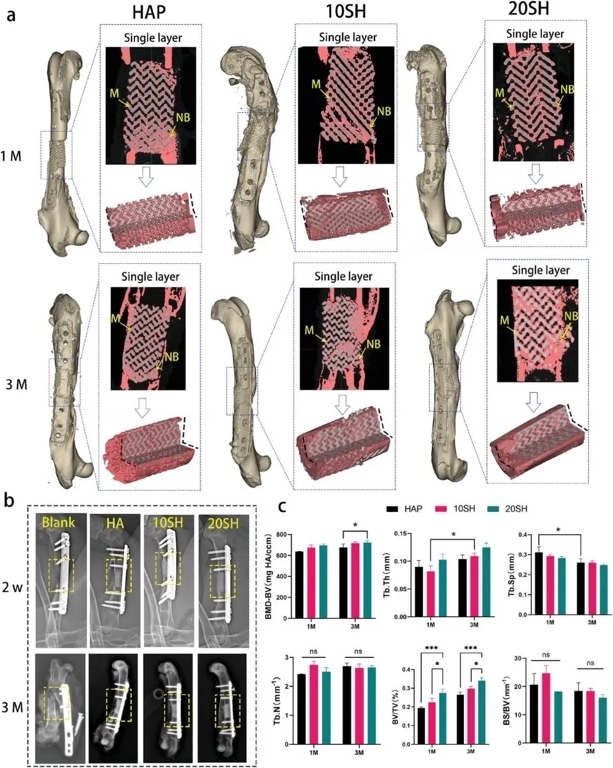 SH组中,新生的骨组织已经融合成连续的结构,支架已经与骨缺损的两端融合。结合半定量分析结果发现,新生骨比例(BV/TV)和新生骨密度(BMD-BV)随骨小梁厚度(Tb.Th)的增加和骨小梁间距(Tb.Sp)的减小而增加。3个月时三组新生骨体积和密度变化趋势与第1个月一致。