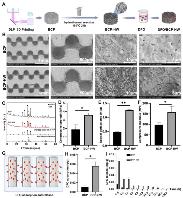本研究通过3D打印结合水热反应制备DFO/BCP-HW复合材料,运用SEM、XRD等多种检测方法,研究BCP和BCP-HW陶瓷的微观结构、相组成、机械性能、比表面积、载药和释药性能。结果表明,BCP-HW形成了均匀的空心管状晶须结构,相比BCP,其机械性能、比表面积显著提升,载药能力从0.0115±0.0029g/g提升到0.5523±0.0121g/g,且具有更持久的药物缓释特性。