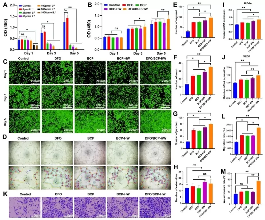 采用CCK-8、活/死细胞染色、Transwell小室、划痕愈合实验和管形成实验等方法,研究不同浓度DFO对HUVECs活力的影响以及DFO/BCP-HW对HUVECs增殖、迁移、成管能力的作用。结果显示,5μmol/L