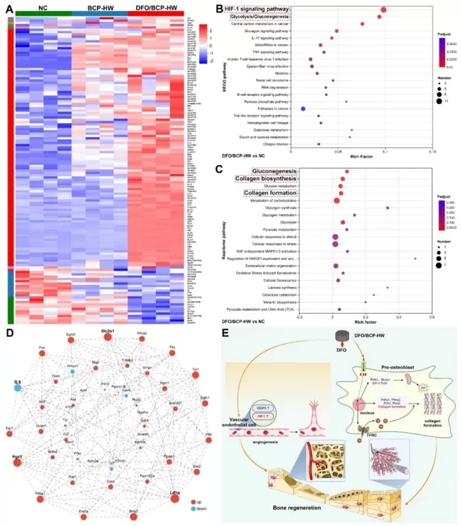 运用RNA测序、差异表达基因分析、KEGG通路富集分析和蛋白质-蛋白质相互作用网络构建等方法,研究DFO/BCP-HW处理后基因表达变化和关键信号通路。结果显示,DFO/BCP-HW通过激活HIF-1信号通路、增强糖酵解和刺激胶原蛋白形成来促进骨再生,确定了Egln3、Slc2a1等关键调控基因。