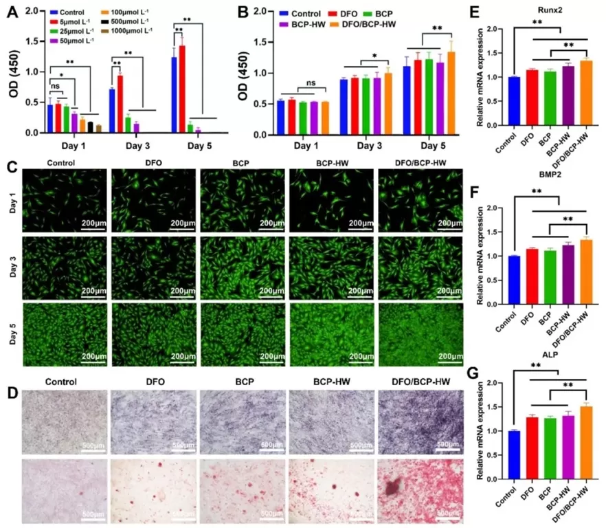 利用CCK-8、活/死细胞染色、ALP染色和茜素红染色以及qRT-PCR等方法,研究不同处理组对MC3T3-E1细胞活力、增殖、成骨分化能力的影响。结果表明,DFO/BCP-HW组促进细胞增殖效果明显,ALP和茜素红染色显示其成骨分化和矿化能力突出,关键成骨基因Runx2、BMP2和ALP的表达显著上调。