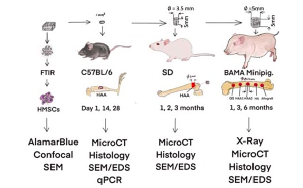 研究小组在大鼠和侏儒猪身上进行了体内临床前试验。这些测试特别表明该材料在三到六个月内完全修复了骨缺损。此外,该材料在四个星期内引发了一层新的坚固、健康的皮质骨的形成。