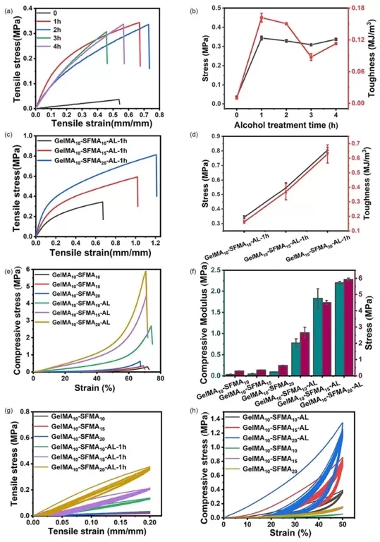 SFMA水凝胶的力学性能进行研究。结果表明,乙醇处理能显著提升水凝胶的拉伸强度、韧性、压缩模量和强度。例如,经1小时乙醇处理的GelMA₁₀ -