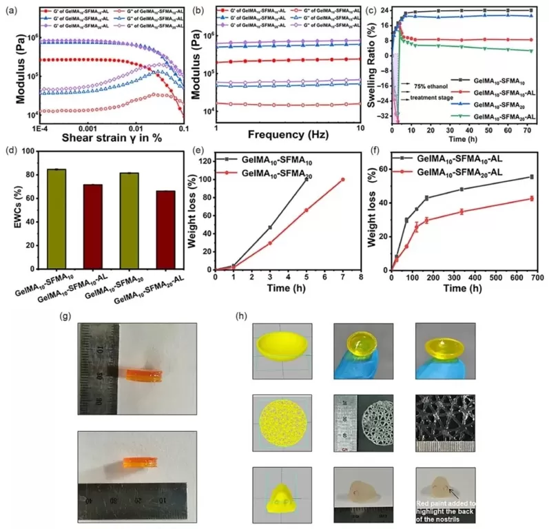 AL水凝胶的溶胀行为、降解性能和3D打印适用性。结果显示,乙醇处理后的水凝胶溶胀率和平衡含水量明显降低,在蛋白酶XIV作用下的降解速率显著减慢。同时,GelMA和SFMA的光交联特性使其溶液适用于DLP