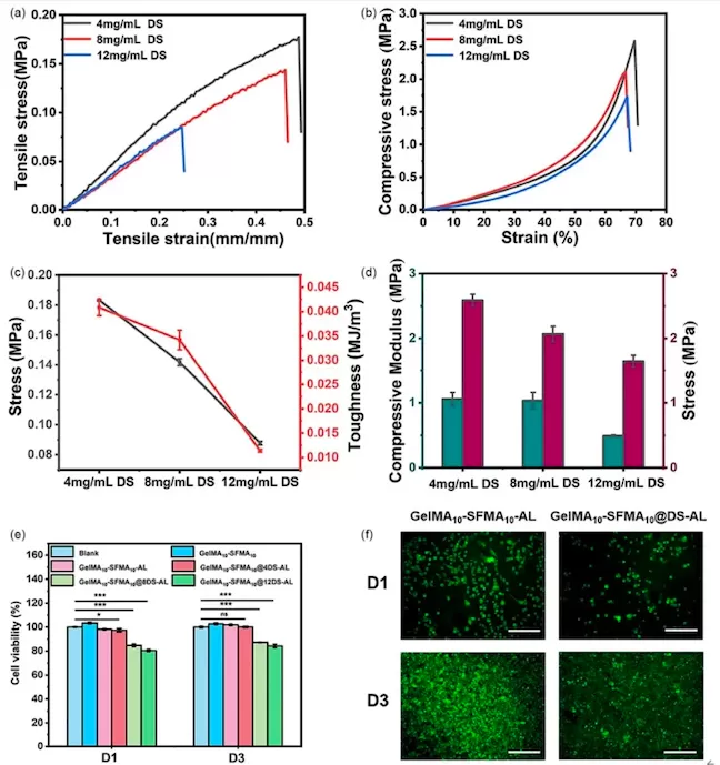 AL水凝胶进行研究。结果表明,负载DS会使水凝胶力学性能有所减弱,但仍能满足软骨再生的基本要求。细胞活力实验显示,4mg/mL