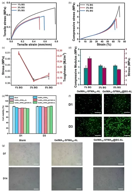 AL水凝胶进行研究。结果表明,随着BG含量增加,水凝胶力学强度有所下降,但1%