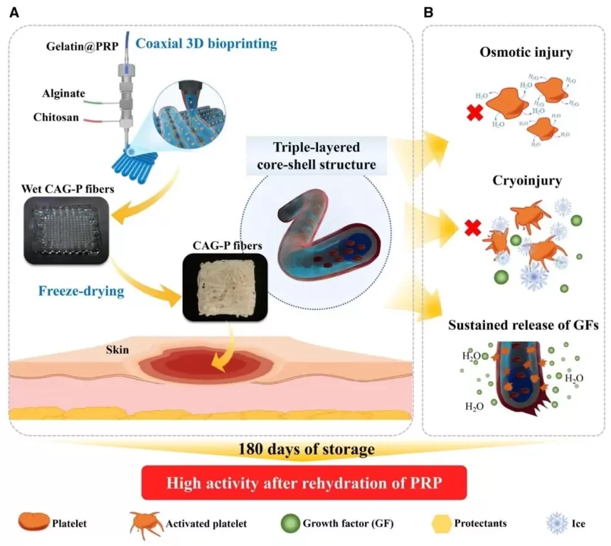 皮肤作为人体最大器官,在日常活动中易受损,慢性伤口管理成为全球公共卫生难题。传统伤口敷料功能有限,难以实现伤口愈合。富血小板血浆(PRP)因富含多种生长因子,在再生医学领域应用广泛,可促进伤口愈合,但它存在诸多局限性。一方面,PRP保存困难且需按需制备,增加了使用难度和成本;另一方面,其在伤口微环境中易快速降解,导致生长因子无法持续释放,影响对慢性伤口的治疗效果。目前多数PRP相关水凝胶敷料虽能部分解决生长因子缓释问题,但长期储存稳定性不足。