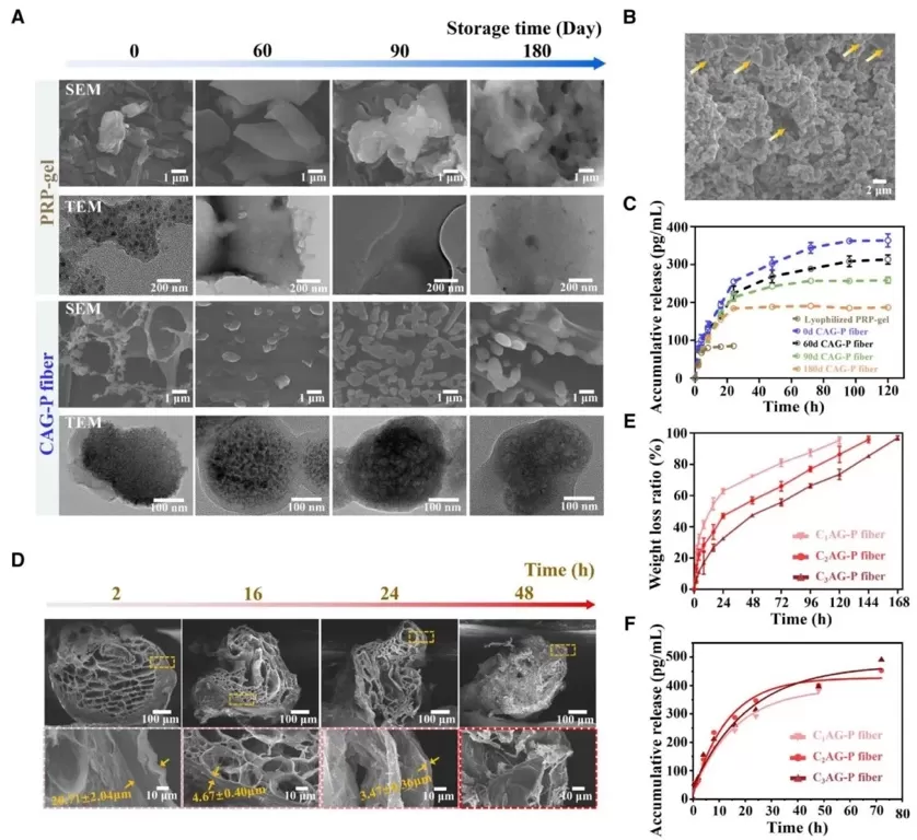 CAG-P纤维的微观结构和降解性能,运用扫描电子显微镜(SEM)和透射电子显微镜(TEM)观察不同储存时间的PRP形态、检测不同时间点特定溶液中VEGF的含量、观察CAG-P纤维在PBS中的降解过程等研究方法,研究了CAG-P纤维中PRP的储存稳定性、VEGF释放行为以及纤维的降解机制。结果显示,CAG-P纤维可延长PRP活性,其VEGF释放为持续释放模式,且通过调节纤维外层CS层流速能控制纤维降解和VEGF释放速度。