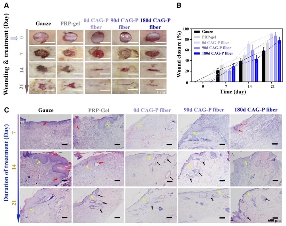 体内伤口闭合和愈合评估,借助建立大鼠全层皮肤切口伤口模型、对伤口进行不同处理并拍照测量伤口面积计算愈合率、对伤口组织进行H&E染色等研究方法,研究了长期储存的CAG-P纤维对伤口的愈合能力。结果显示,CAG-P纤维组伤口愈合效果良好,后期愈合速率超过PRP-gel组,促进了伤口愈合。