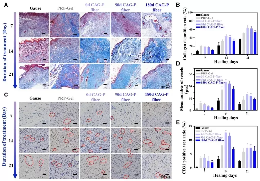 不同处理组伤口的组织学分析,通过对不同处理组伤口组织进行Masson染色观察胶原沉积、进行CD31免疫组化染色评估血管生成情况并量化分析等研究方法,研究了不同处理方式对伤口愈合过程中组织修复和血管形成的影响。结果表明,随着时间推移,CAG-P纤维处理组的胶原纤维含量增加且更成熟,血管密度在后期高于对照组,加速了伤口从血管生成增殖期向成熟期的过渡,有利于伤口愈合。