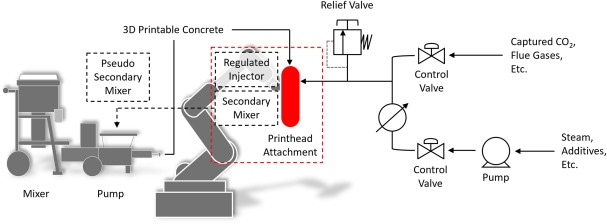 为了实现这一新型3D混凝土打印系统,团队将3D打印机与二氧化碳泵和蒸汽喷射器连接。在打印过程中,系统将二氧化碳和蒸汽注入混凝土混合物中。二氧化碳与混凝土成分反应后,转化为固体并永久储存,锁定在材料内部。同时,蒸汽的引入有助于提升3D打印结构对二氧化碳的吸收能力,从而增强混凝土的性能。