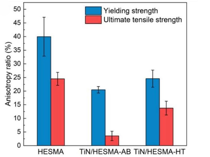 △添加 TiN 可降低 LPBF 打印 HESMA 样品的屈服强度各向异性。图片来自 Qiu 等人。