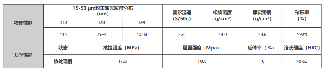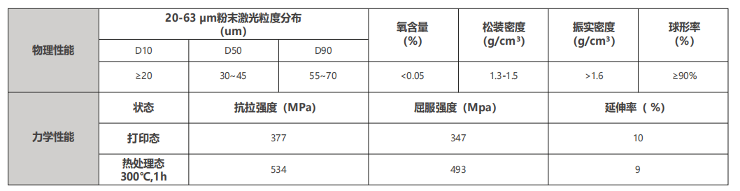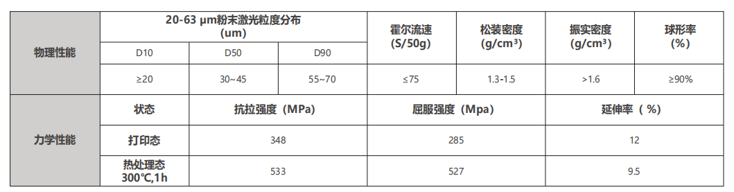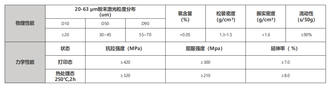 具有较高的强度和硬度,导电性、导热性以及耐磨性。粉末铺粉效果好,打印成型质量好。
