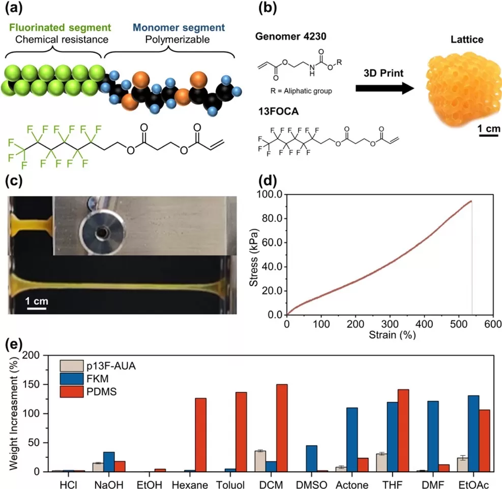 kPa(图1d)。随后该团队通过溶胀试验来表征印刷材料在各种酸、碱和常见有机溶剂中1小时后的化学稳定性,得出高氟含量赋予了特殊的耐各种腐蚀性有机溶剂,膨胀比优于标准的PDMS和氟橡胶(图1e)。