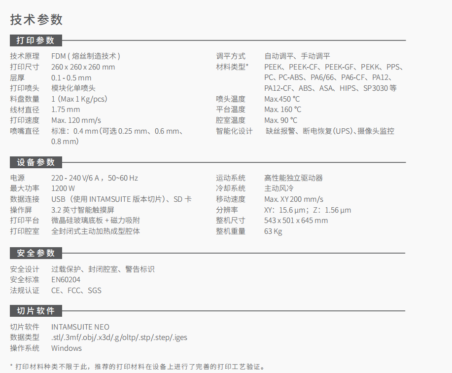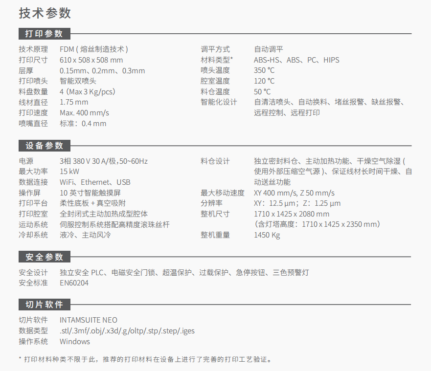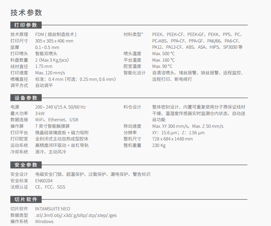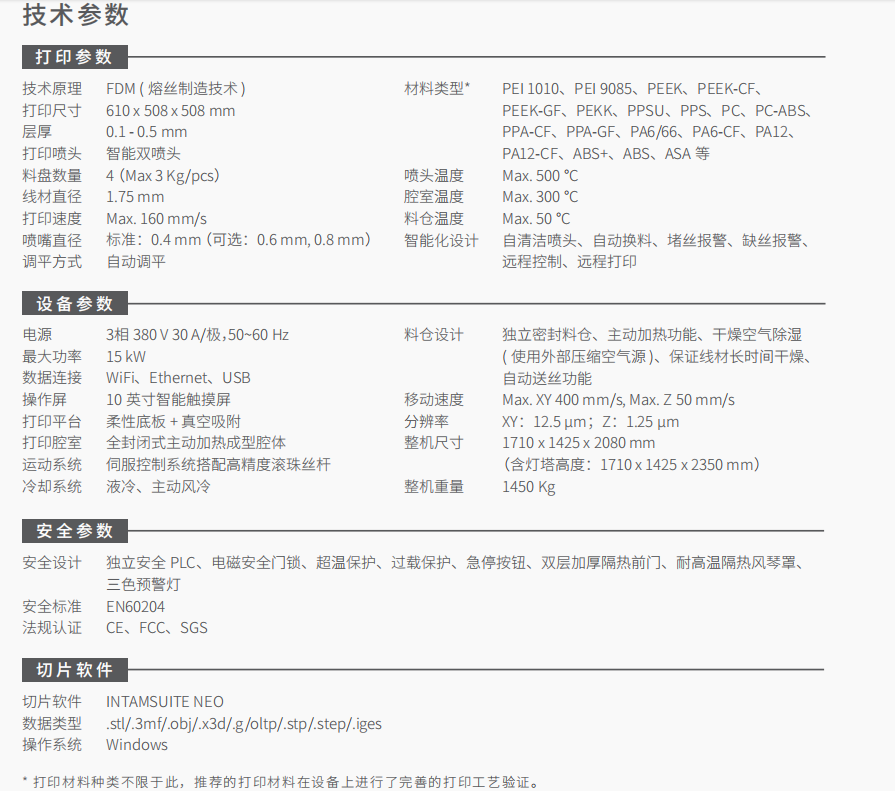PEKK、PEI1010、PEI9085、PPSU 打印的需求。该款机型打印尺寸高达 610 x 508 x 508