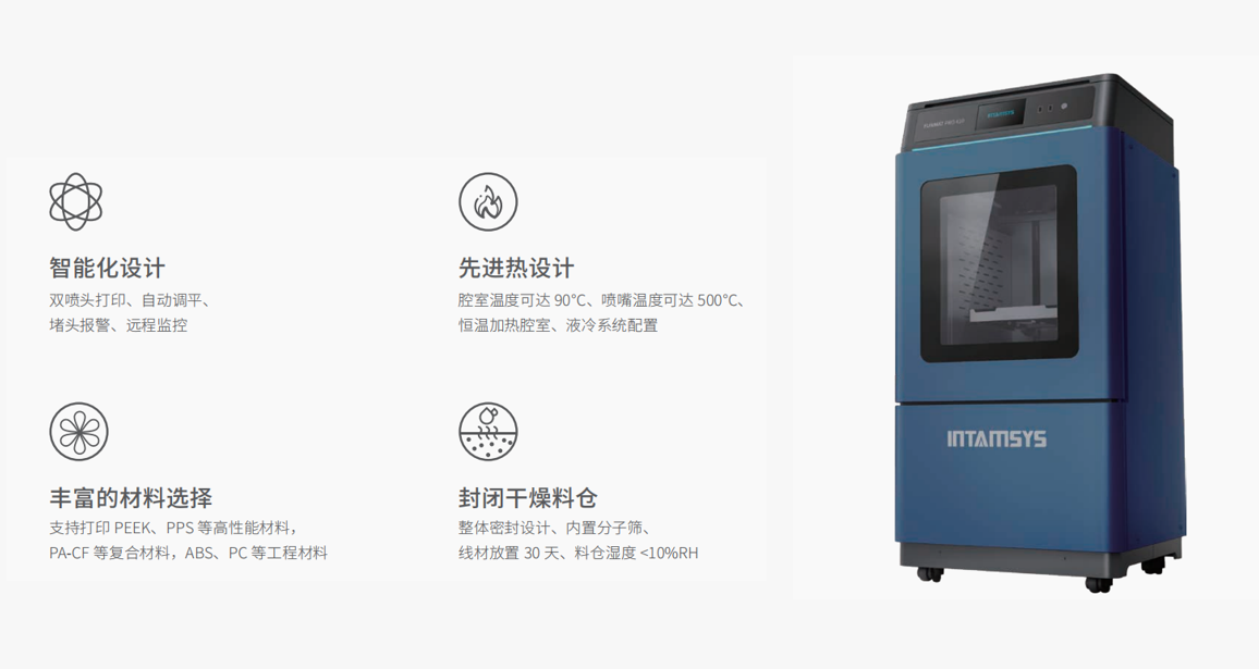 下面,来详细介绍一下INTAMSYS 远铸智推出了哪些工业级的FDM设备和配套硬件、软件: