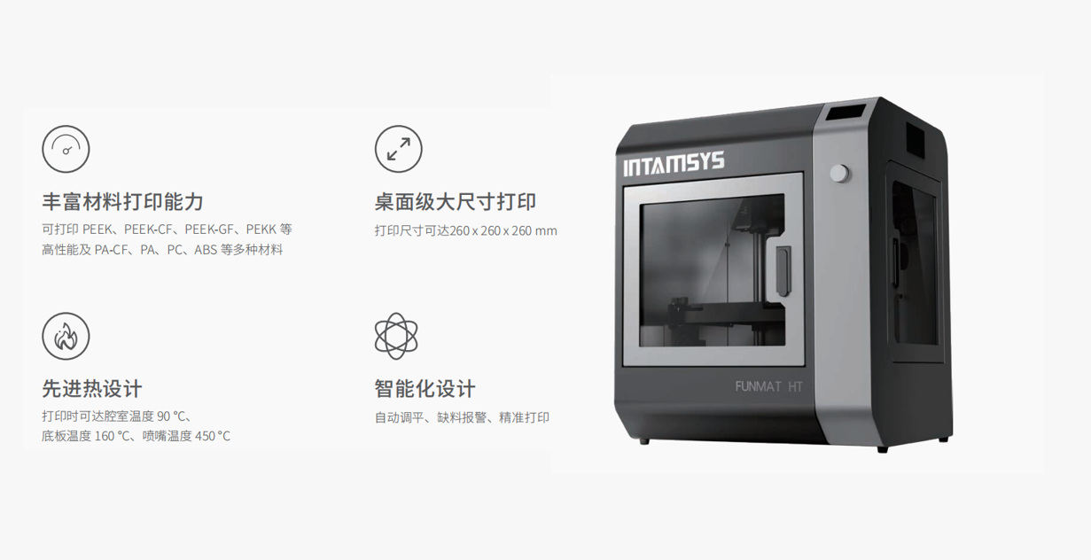 的打印尺寸,打印性能表现也依旧优异。FUNMAT HT 不仅可打印常见工程材料,还可以打印 PEEK、PEEK-CF、PEEK-GF、PEKK
