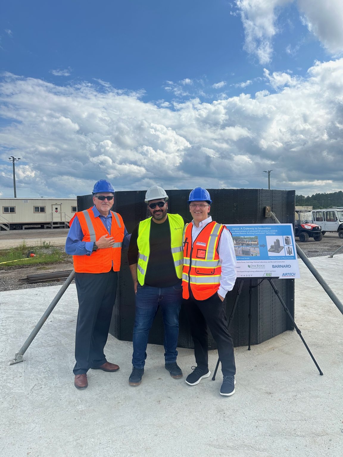 △从左至右,橡树岭国家实验室的罗伯特·瓦格纳、艾哈迈德·阿拉比·哈森和瑞安·德霍夫参观了赫尔墨斯项目现场,观看混凝土浇筑过程。图片来源:橡树岭国家实验室,美国能源部