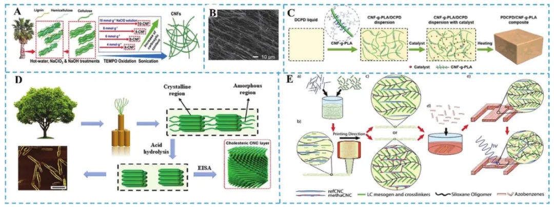 纤维素是一种线性多糖,是地球上最丰富的生物聚合物纤维素分子可以有规律地排列成两种主要形式,即纤维素纳米晶体(CNCs)和纤维素纳米原纤维(CNFs)。CNFs通常通过TEMPO氧化获得,所产生的羧甲基提高了CNFs在水中的分散性和胶体稳定性(图1A)。CNFs具有独特的几何形状,其特征是带状结构、高宽高比,以及形成纠缠网络的能力,其直径为几纳米,长度为几微米(图1B)。目前,已有研究者将PLA接枝的CNFs用作抑制剂和强化剂,制备可3D打印的强韧性聚双环戊二烯(PDCPD)基复合材料(图1C)。