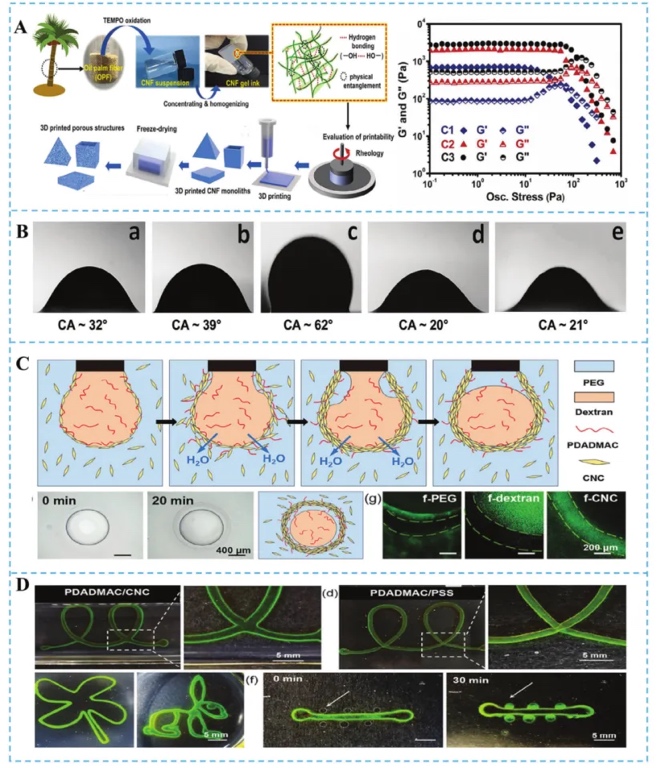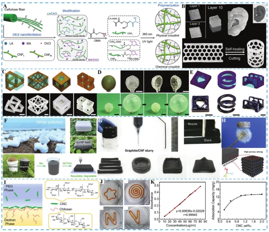 CNCs通常是通过去除大部分非晶态区域,从而保留高结晶区域来生产的(图1D)。目前,硫酸水解仍然是主要的方法,产生的纳米纤维素具有37至55.6 mV的zeta电位。表1总结了近5年来CNFs和CNCs的代表性来源、改进、3D打印方法、合并技术及其优势。