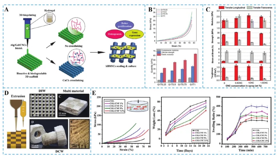 目前,纳米纤维素辅助3D打印技术已成为组织工程和药物输送领域的研究热点。结构明确的打印支架可以促进细胞生长和分化,提供机械支持,而个性化的给药系统可以更好地改善药物的药代动力学和生物利用度,降低毒性,提高治疗效果。