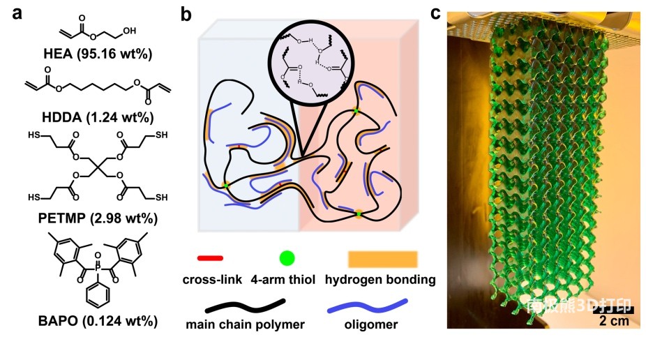重量百分比)(图1a)。水基绿色食品染料(0.497 重量百分比)用于防止打印过程中光线过度穿透,从而提高打印表面的质量与分辨率。