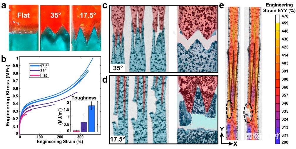107%的应变(见图3b),比平面界面高出6倍的韧性。然而,如图3c所示,这些样品大部分沿着嫁接界面发生了粘合性断裂(尽管在相对嫁接件的外边缘观察到一些小碎片)。将鱼骨图案的锐度增加到17.5°,产生了截面面积约为平面样品的3.3倍的界面。在这些样品中,断裂始终发生在远离嫁接界面的位置(见图3d),表明工程嫁接有效地改变了最低断裂能量路径,使其水平穿过样品而不是在自愈界面处。尽管显著增强了愈合材料的性能,但鱼骨齿处的应变集中导致在达到块状样品的原始材料性能之前就引发了断裂(见图3e)。应变集中在测试开始时的牙齿接口处出现,可能是由于两个面之间的对准和几何形状不完善所致。17.5°样品中的断裂事件始于应变集中处,峰值约为460%,这一失败应变与铸造脱水样品中的单轴拉伸失效情况非常吻合。