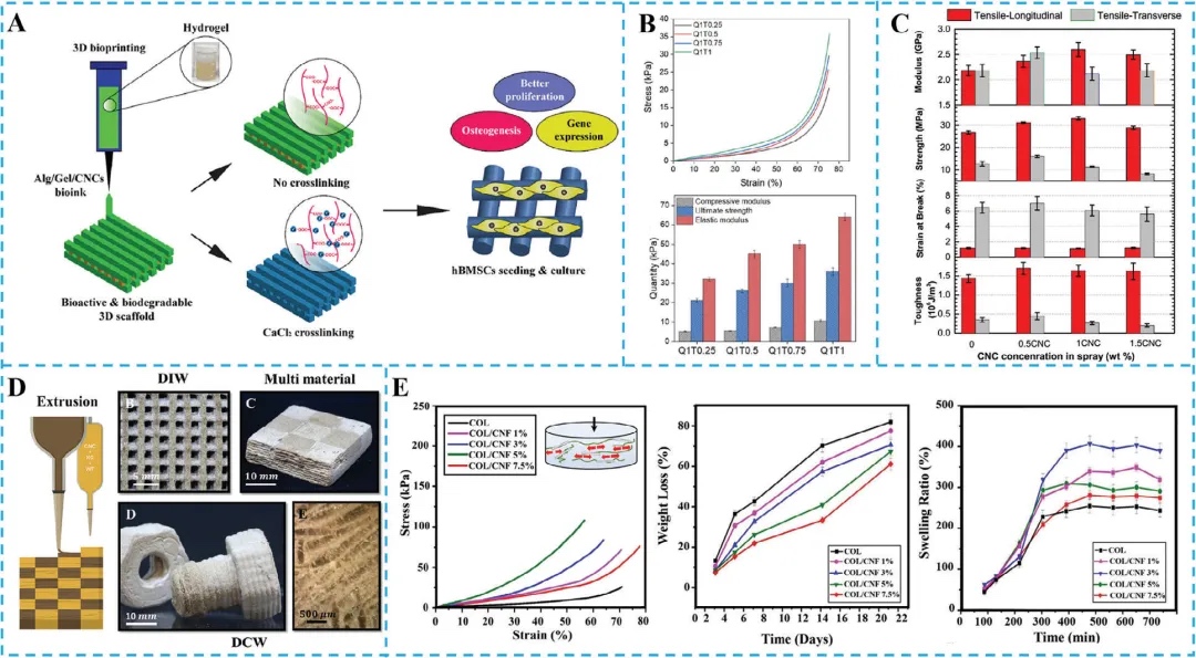 2、在生物医学领域的应用潜力:设计生物材料作为人工细胞外基质以模拟天然组织并重建复杂的三维微环境仍然面临挑战。CNFs和CNCs因其良好的生物相容性和机械性能,显示出广阔的生物医学应用潜力。研究表明,高比例CNCs与聚乙烯醇(PVA)结合,可制备适合人工血管的墨水,显著提升拉伸模量并具有与天然动脉相似的稳定性。此外,CNCs改善超声成像效果。通过3D打印,开发的生物可降解水凝胶能促进细胞增殖和骨组织再生。CNFs不仅增强细胞附着和机械强度,还可用于导电神经支架,促进神经细胞生长。同时,CNCs与其他材料结合具有抗菌特性,帮助对抗抗生素耐药菌。这些进展表明,纳米纤维素在3D打印生物材料中的应用能够有效构建与天然组织相似的细胞外基质,促进组织再生和修复,并在先进医疗设备和个性化药物递送系统方面展现广阔前景(图4)。