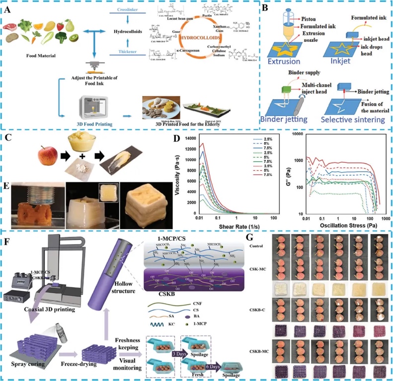3、纳米纤维素在食品相关领域的应用:虽然3D打印在多个领域具有潜力,但在食品行业的应用受到流变特性不足、成分复杂和效率低的限制。研究显示,以淀粉、CNFs、乳粉、燕麦和蚕豆蛋白为基础的材料具有一定的可打印性,3D打印可作为食品加工的快速原型工具。然而,许多食品泥流变性不足,限制了直接喷墨(DIW)打印的应用。CNCs能够改善流变特性,适用于自支撑结构打印,并可作为可生物降解的保护壳,减少包装需求。纳米纤维素在智能食品包装中也具有广阔前景,如CNF基标签可监测水果新鲜度。总之,纳米纤维素有望提升食品的定制化、安全性和可持续性(图5)。