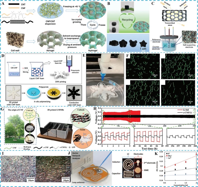 5、纳米纤维素在电导应用领域的应用:纳米纤维素已广泛应用于导电材料的大规模制备。Huang等人展示了一种无需化学交联的常温干燥方法,利用纤维素纳米纤维(CNFs)和碳纳米管(CNTs)制备功能性气凝胶,这种气凝胶具有高比电磁屏蔽和能量存储性能,可作为自支撑电极负载活性材料。此外,通过在CNF泡沫上原位聚合聚吡咯(PPy)制备了轻质导电泡沫,这种泡沫表现出剪切变稀行为,可通过针头打印。还有研究开发了使用CNFs通过3D打印克服印刷锂金属的挑战的高性能锂金属电池(LMBs),以及通过添加银纳米线(AgNWs)增强CNFs和CNCs的导电油墨,用于制造具有出色性能的传感器。这些应用展示了纳米纤维素在电子领域,尤其是在传感器、显示器和能量存储设备中的潜力(图7)。