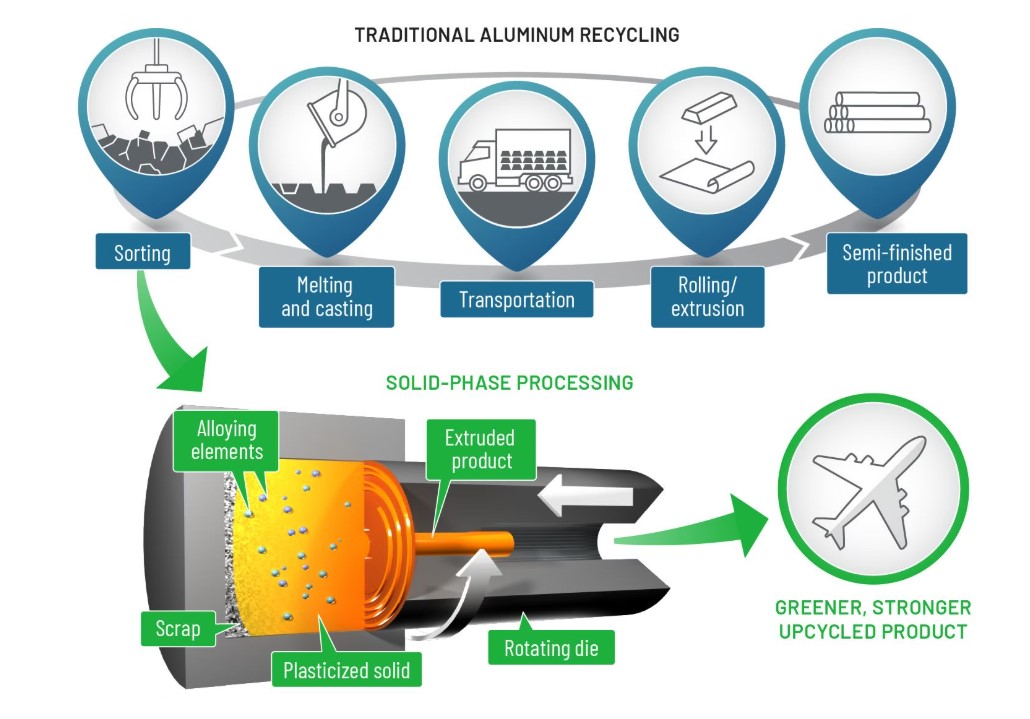 创新的固相合金工艺可在几分钟内将铝废料与铜、锌和镁混合转化为精确设计的高强度铝合金产品,而使用传统的熔炼、铸造和挤压生产相同产品则需要几天时间。研究团队使用 PNNL 专利技术“剪切辅助加工和挤压”(ShAPE)来实现他们的研究成果。然而,研究人员指出,这些发现应该可以通过其他固相制造工艺重现。在 ShAPE 工艺中,高速旋转的模具产生摩擦和热量,将大块的起始成分分散成均匀的合金,其特性与新制造的铝锻造产品相同。固相方法消除了能源密集型批量熔炼的需要,再加上来自废料的低成本原料,有可能大幅降低制造这些材料的成本。对于消费者来说,这意味着回收的铝产品将具有更长的使用寿命和更好的性能,而且成本更低,无论是汽车、建筑材料还是家用电器的部件。