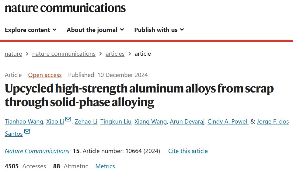 这项研究的成果最近以题为“Upcycled high-strengthaluminum alloys from scrap through solid-phase alloying”发表在《自然通讯》杂志上。