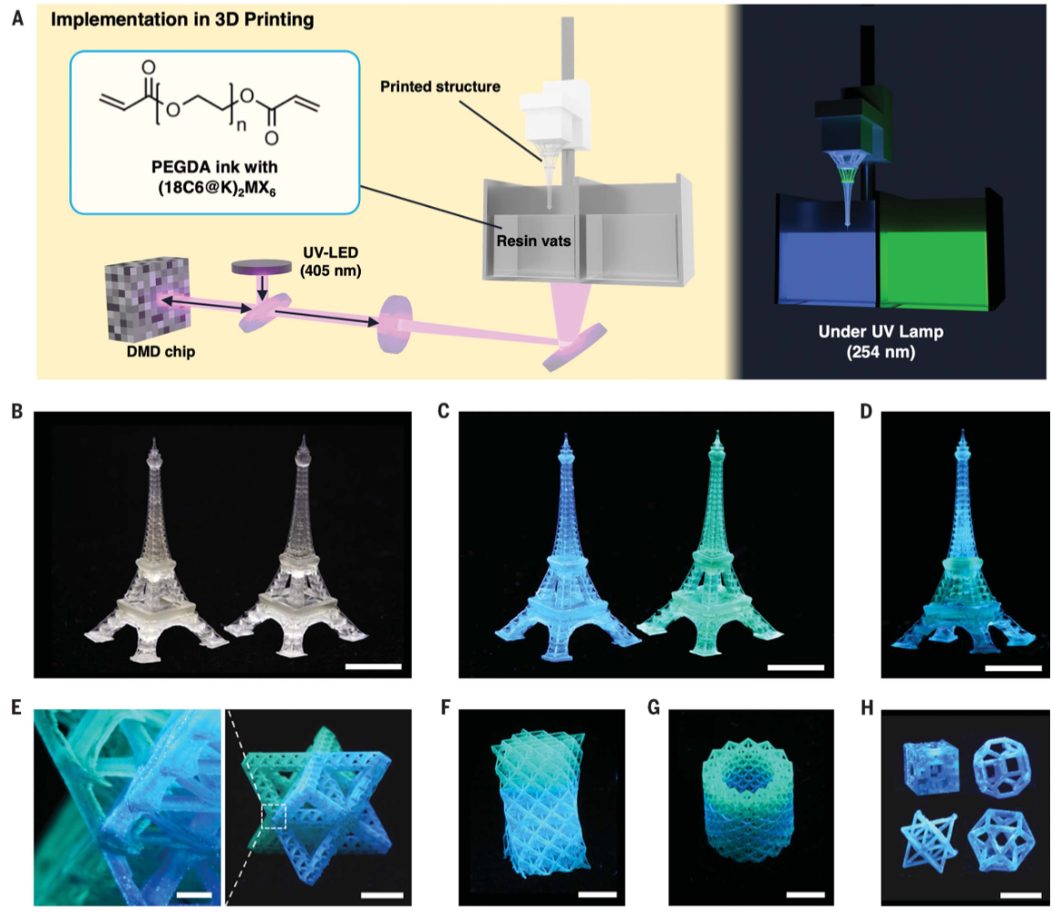 打印发光埃菲尔铁塔。 (D) 254 nm 紫外线激发下的双色发光埃菲尔铁塔。 (E 到 H)